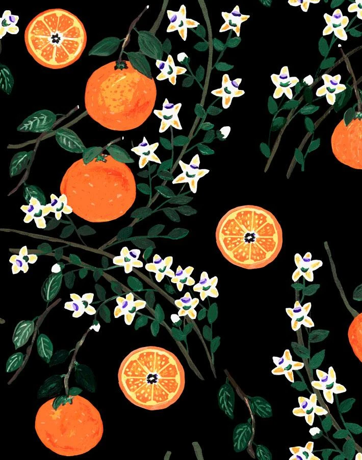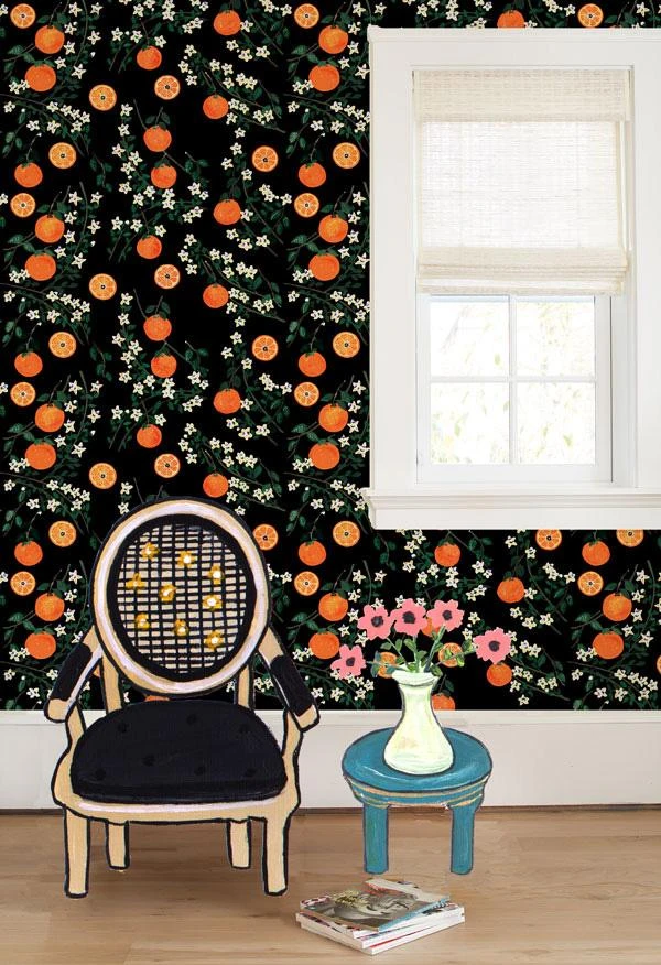 Full of sliced citrus dancing in a bouquet of orange blossoms, Arance Dolci is a wallpaper originally painted by hand that evokes a sweet and fragrant world of orange groves. The matte black background will add a sophisticated touch to your kitchen or cafe.