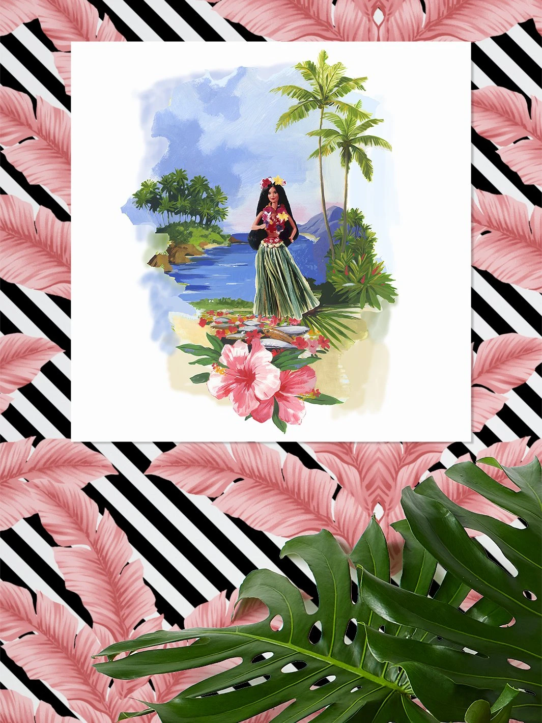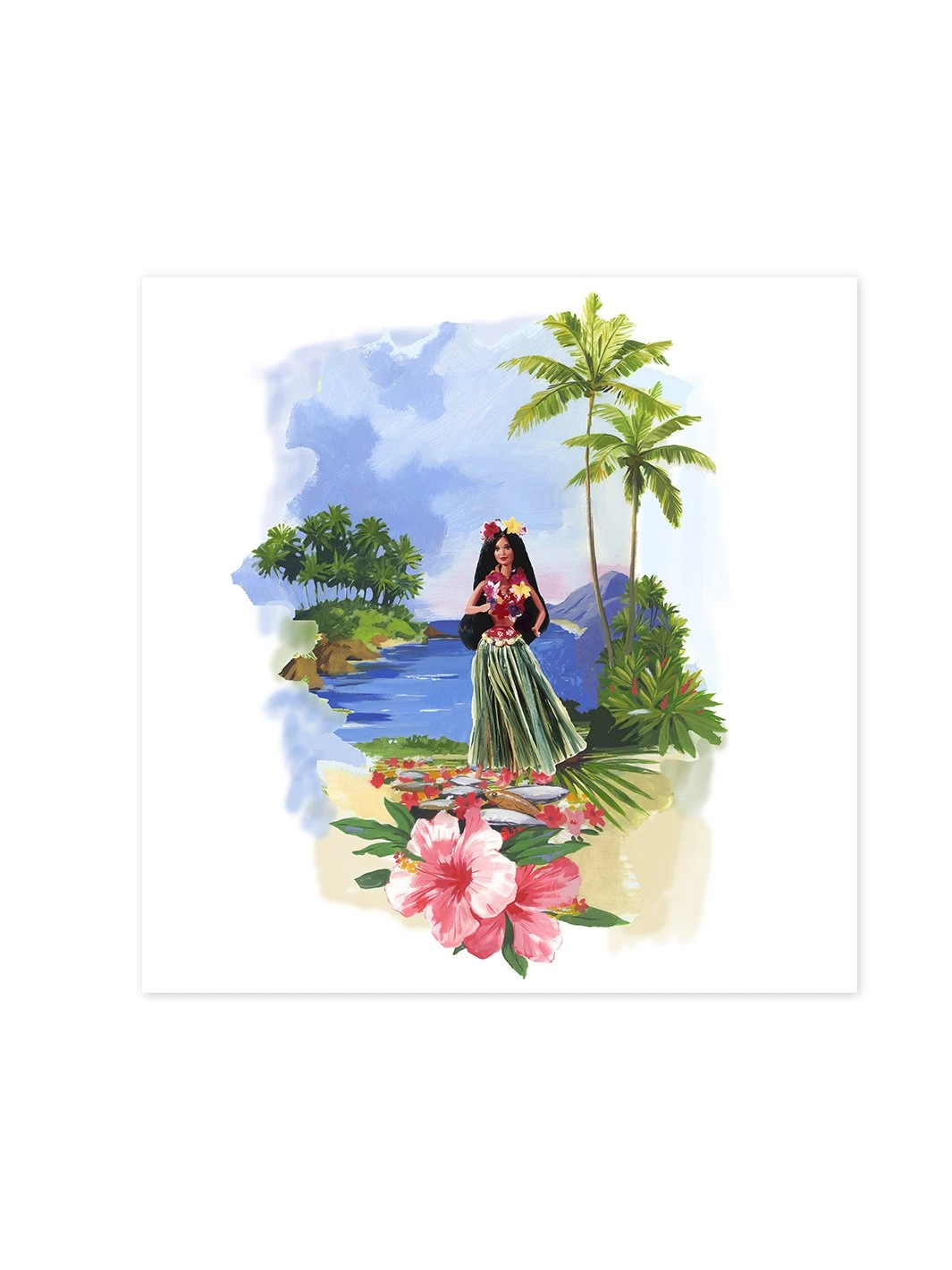 Set in paradise, this gorgeous artwork features Hula Barbie™ with pink hibiscus flowers and oceanside palm trees. Each piece is printed on ready-to-hang, unframed modern acrylic.