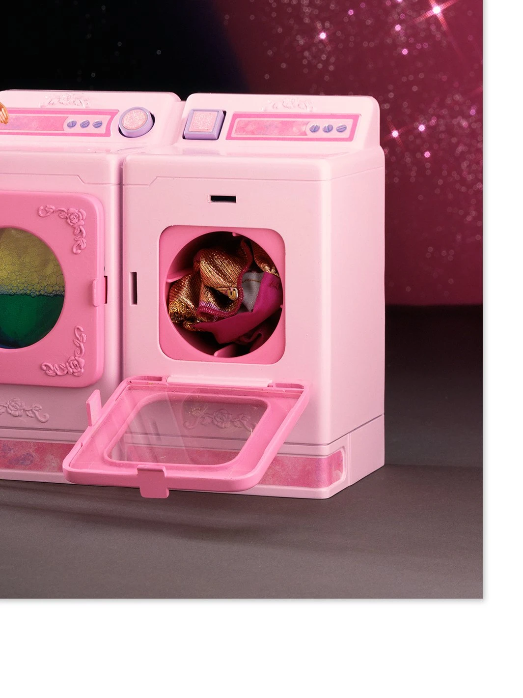 This photograph graced the box cover of several “Pink Sparkles” playsets in the early 1990’s. The Wallshoppe creative team stripped away all the text and graphics to showcase the beauty of the photo itself and the story Barbie seems to be telling about herself. It’s a story that says: I’m not too cool to do my own laundry…but I prefer to do it with a glamorous hairdo and pumps that match my appliances.