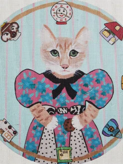 Shown here with her pet bird Daniel, this fashionable kitty is wearing a floral silk wrap dress in vibrant yellow and orange tones.Â
