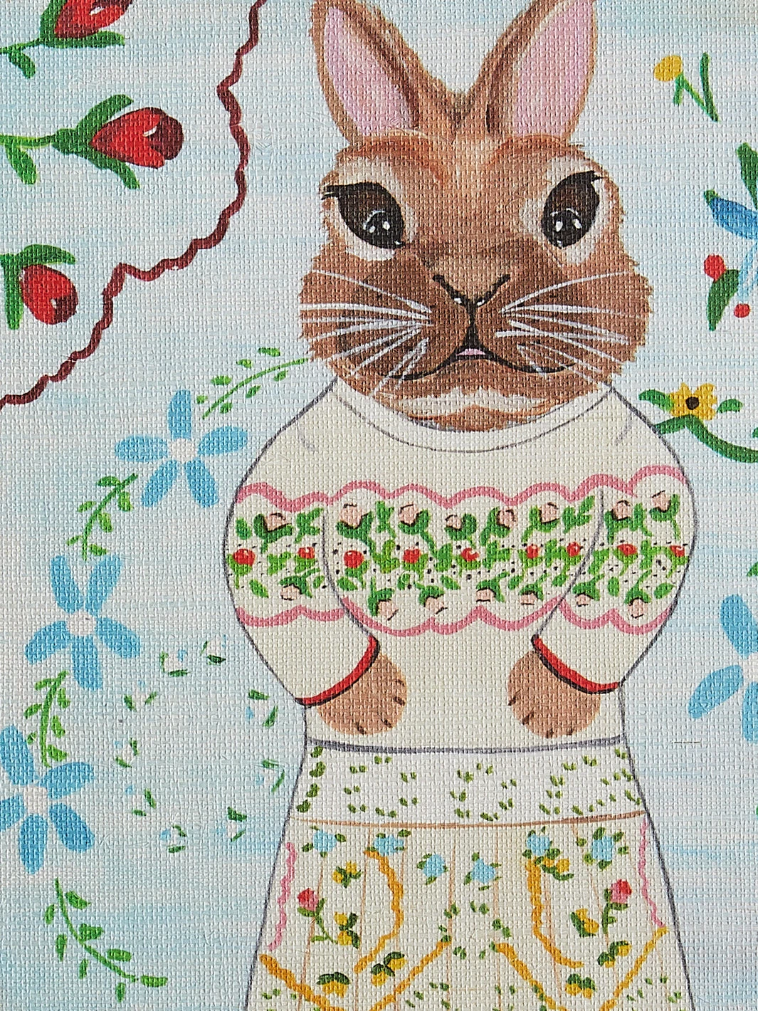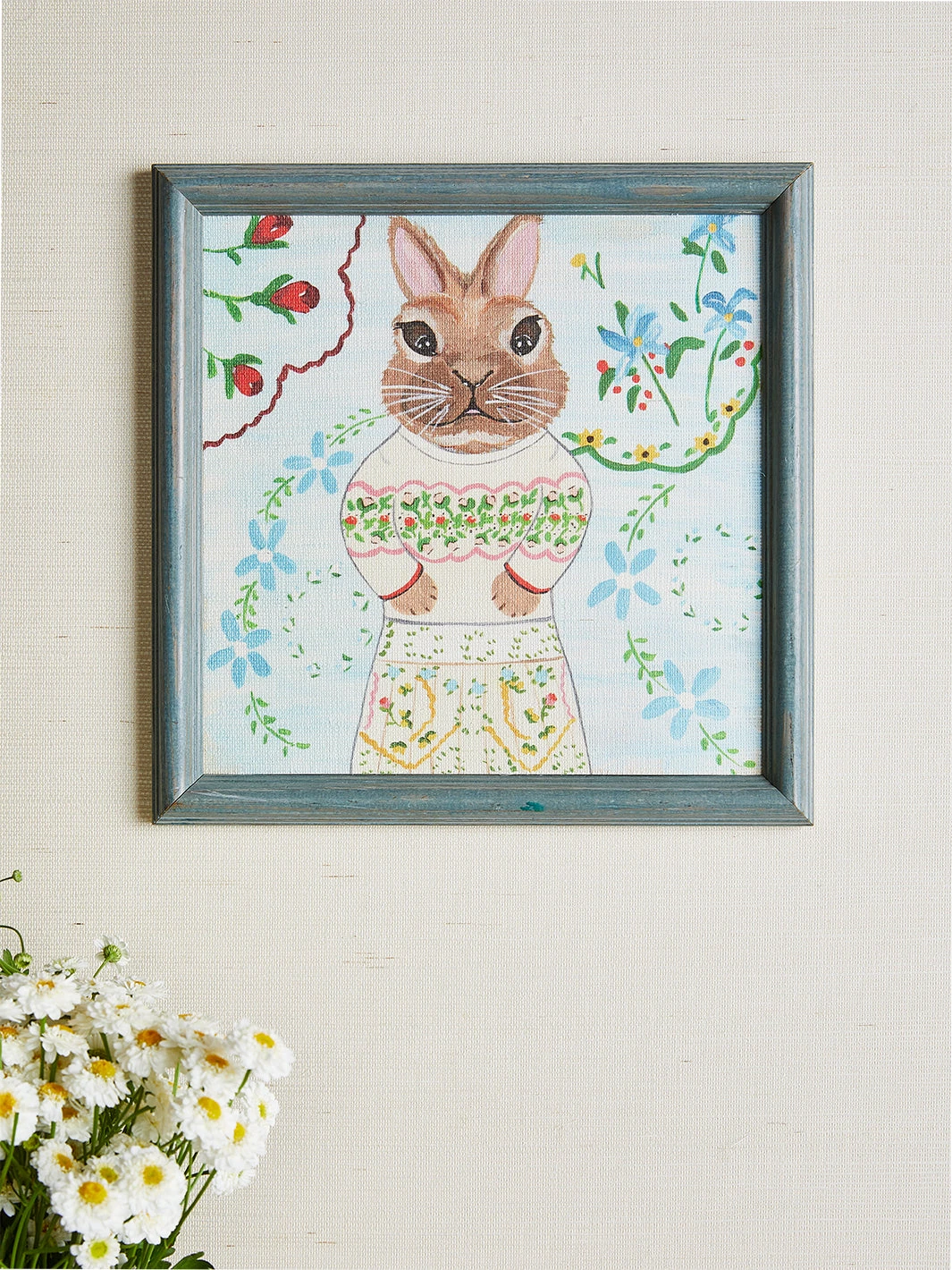 This print by NYC artist Carly Beck featuring a fanciful rabbit will fill your home with delight. Wearing a classic cashmere floral crew neck with an embroidered skirt, her ensemble is inspired by her many trips to the garden.
