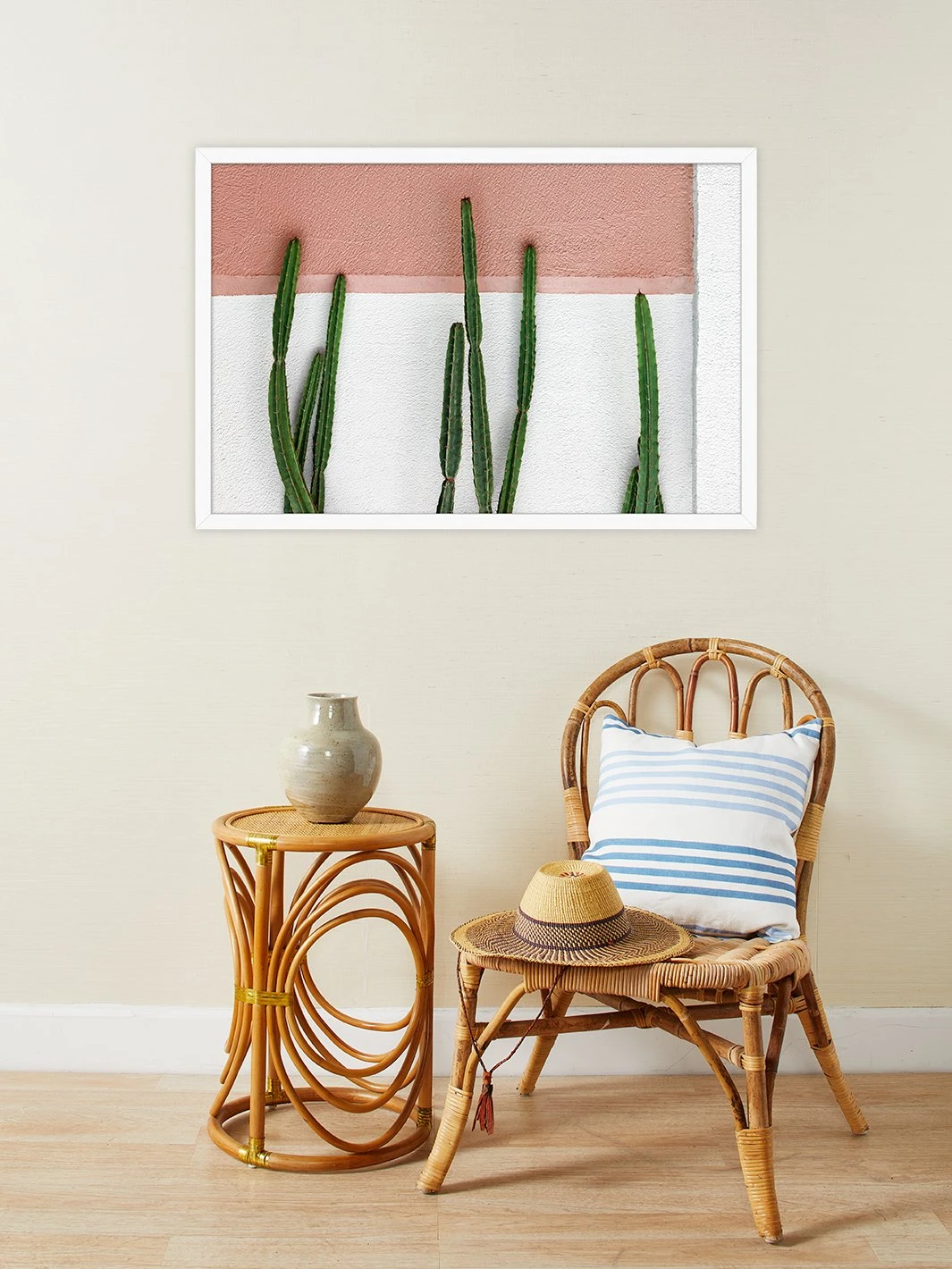 Our ‘Cacti Block’ framed art is a hip, framed photograph of tall reaching cacti against a pink and white textured wall.