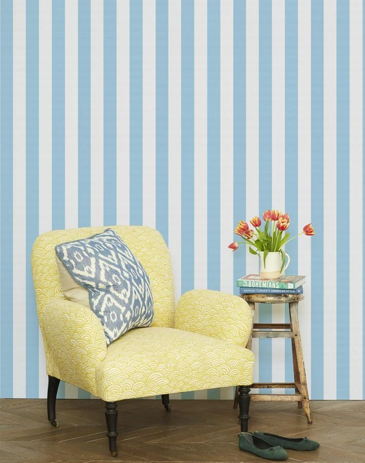 Brighten up a bedroom with one of our striped wallpapers ready for summer with a selection of warm summer colors such as creamsicle, rose, storm, watermelon, lapis or lime. Wallshøppe’s Candy Stripe wallpaper collection includes 18 bold color ways for a contemporary home aesthetic. Our striped wallpaper panels can be hung vertically or horizontally, this choice is easy. Combining a bold color striped wallpaper next to a solid color statement wall is sure to transform any living room or dining room into a chic modern living space.