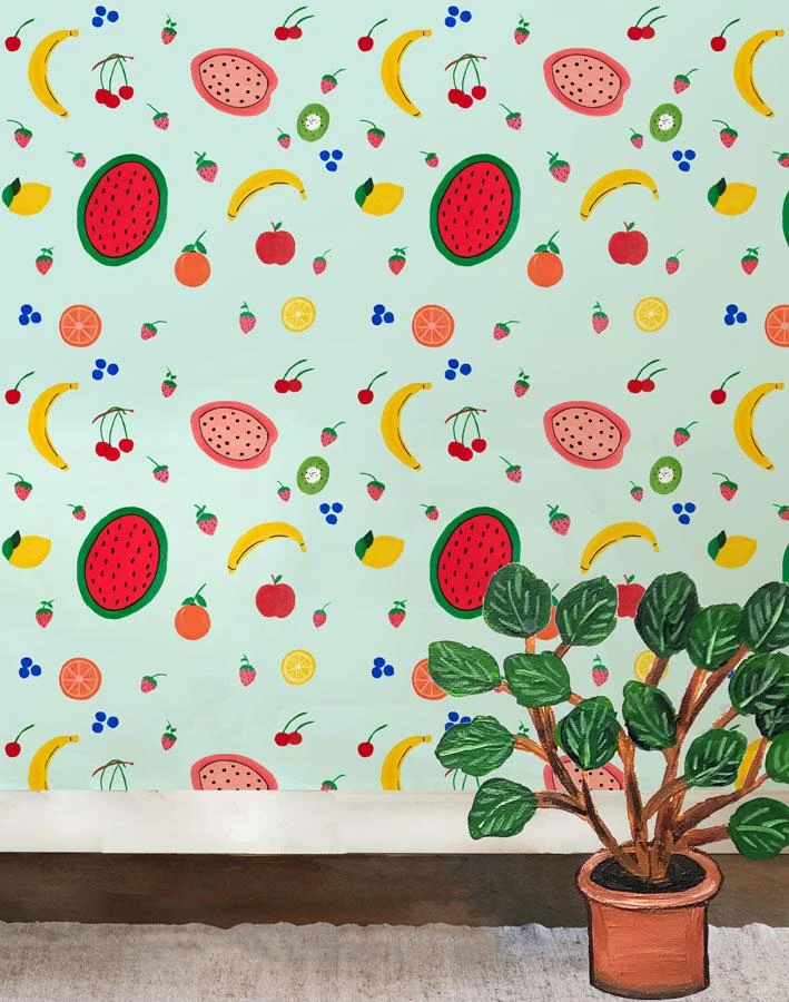 Our Fruit Punch wallpaper is bunches of fun with hand-painted cherries, bananas, melons and strawberries. Mix it up with this wallpaper, perfect for your playroom or kitchen in a pale robins egg colorway.