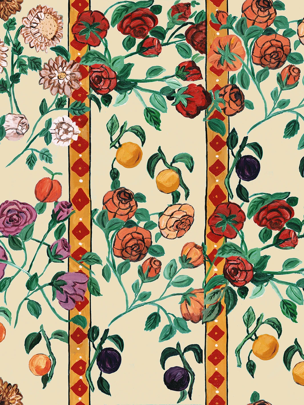 New York City based designer Carly Beck has teamed up with The Carlyle to create this vibrant wallpaper that embodies the lushness of a cozy Upper East Side Tea Room with fruits and florals. Shown here with a cream background, making the perfect contrast to the warm florals and fruits.