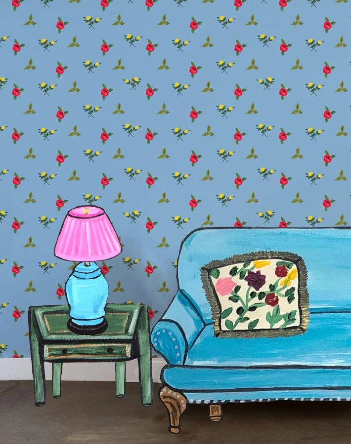 Grand Villa Garden is the wallpaper pattern of countryside daydreams. With sweet red buds, miniature yellow roses and its trio of leaves, this designer wallpaper in tranquil blue evokes a sweet floral moment and will complete your bathroom or adorable nursery.