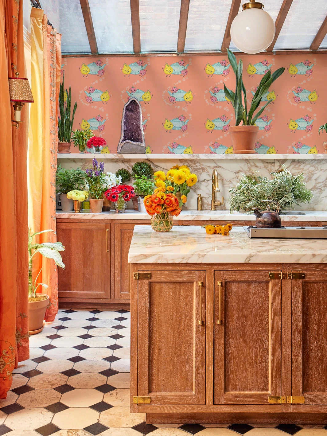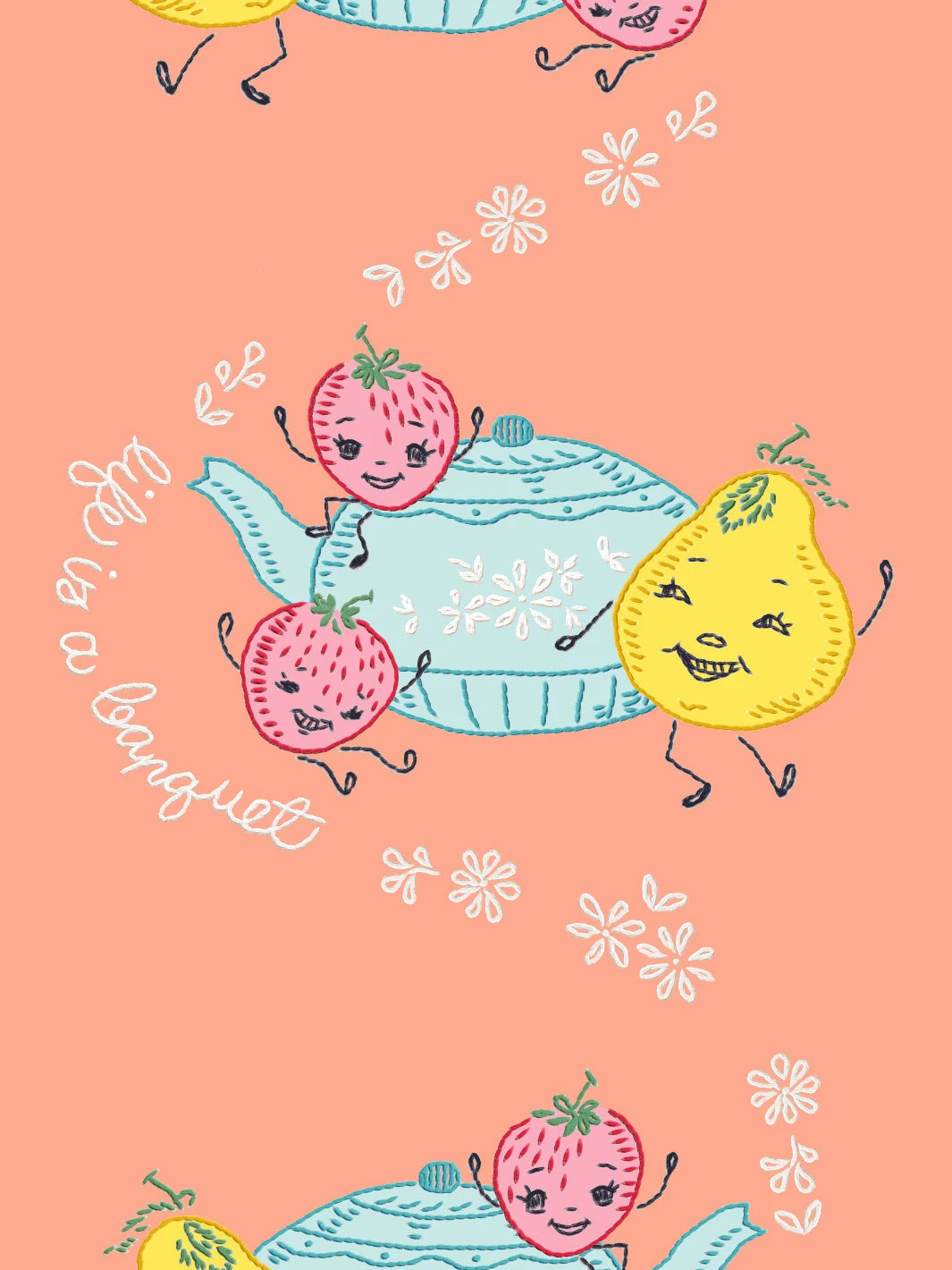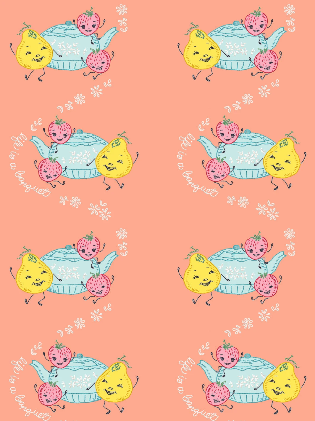 Our “Life Is A Banquet” collection is sure to brighten any space with its whimsical fruity characters and charming colorways. This vintage-inspired wallpaper is Lingua Franca’s foray into the “home” category. The design takes inspiration from both vintage dish towels and a movie inspired by founder Rachelle Hruska MacPherson’s mother-in-law: “Auntie Mame”. In her words, “Life is (indeed) a banquet, and most poor suckers are starving themselves!”