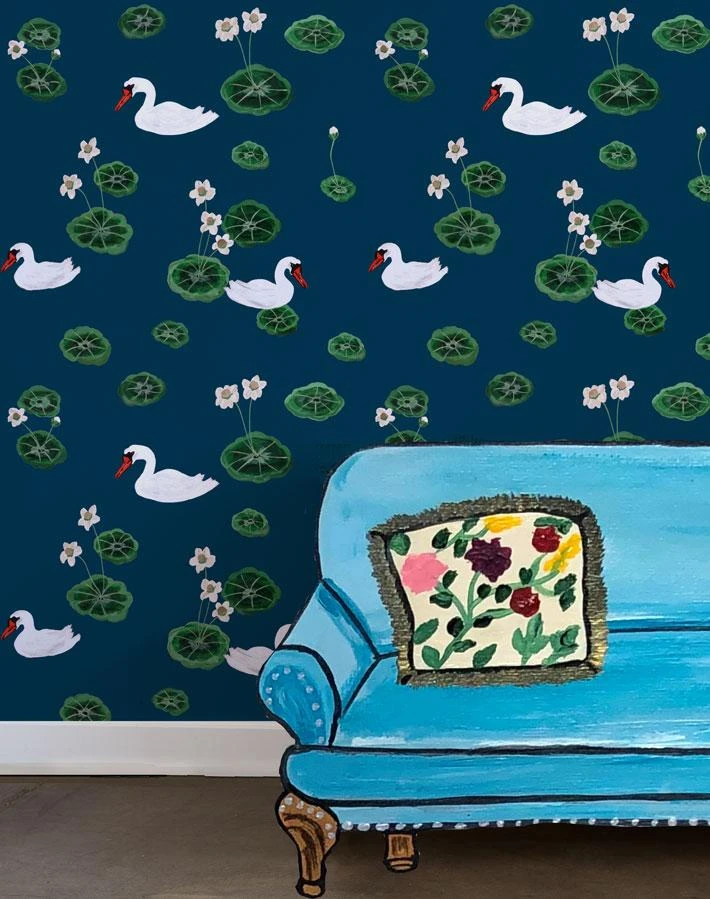 Enjoy the peacefulness of our Lily Pad Lake wallpaper, designed to capture the tranquility of still waters with all the personality of hand-painted white ducks in their natural habitat. The work space in your home office will never look better than surrounded by enchanting green lily pads on a peacock-colored pond, brought to life by our traditional or peel and stick wallpaper.