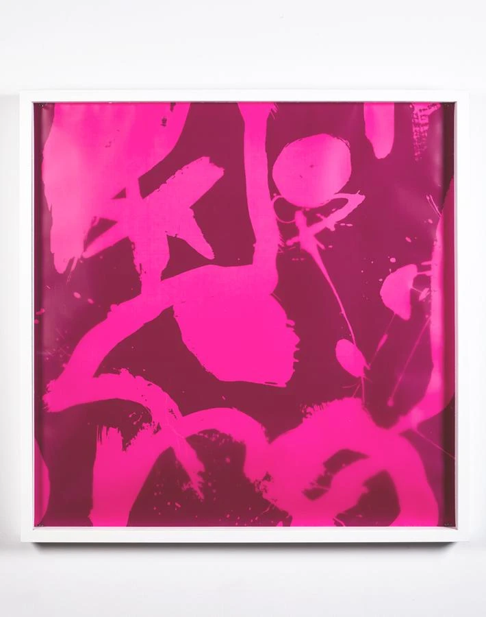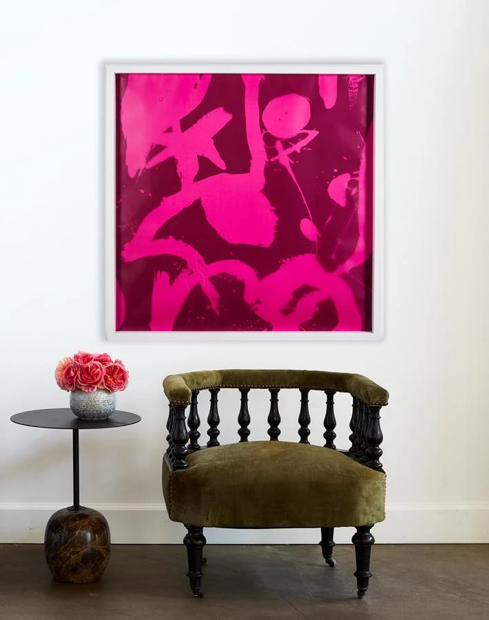 Fashion designer Chris Benz took a surrealist spin on color with this Miro inspired illustration. This unique piece is printed on vellum which is then layered on a painted mat with artist pins. The crisp white frame accentuates the pop of color and form.
