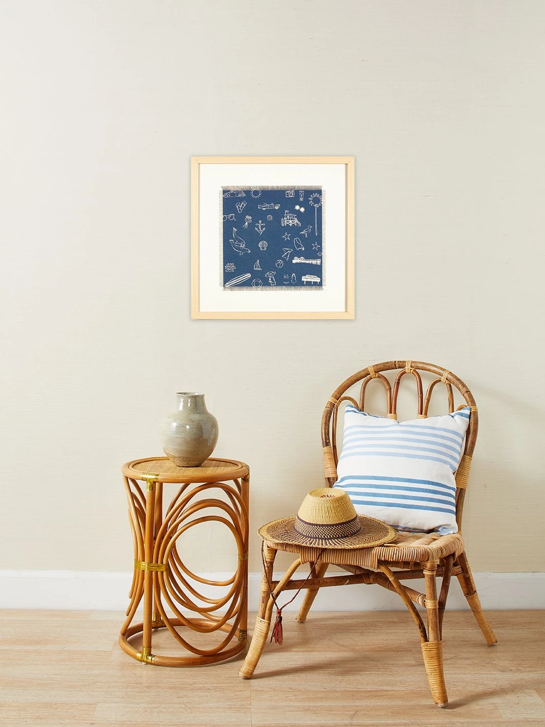 Our ‘Malibu Beachlife Navy’ framed art is a modern, southern California take on coastal. From playing seals to movie reels, this peice celebrates all of the good vibes of Malibu.