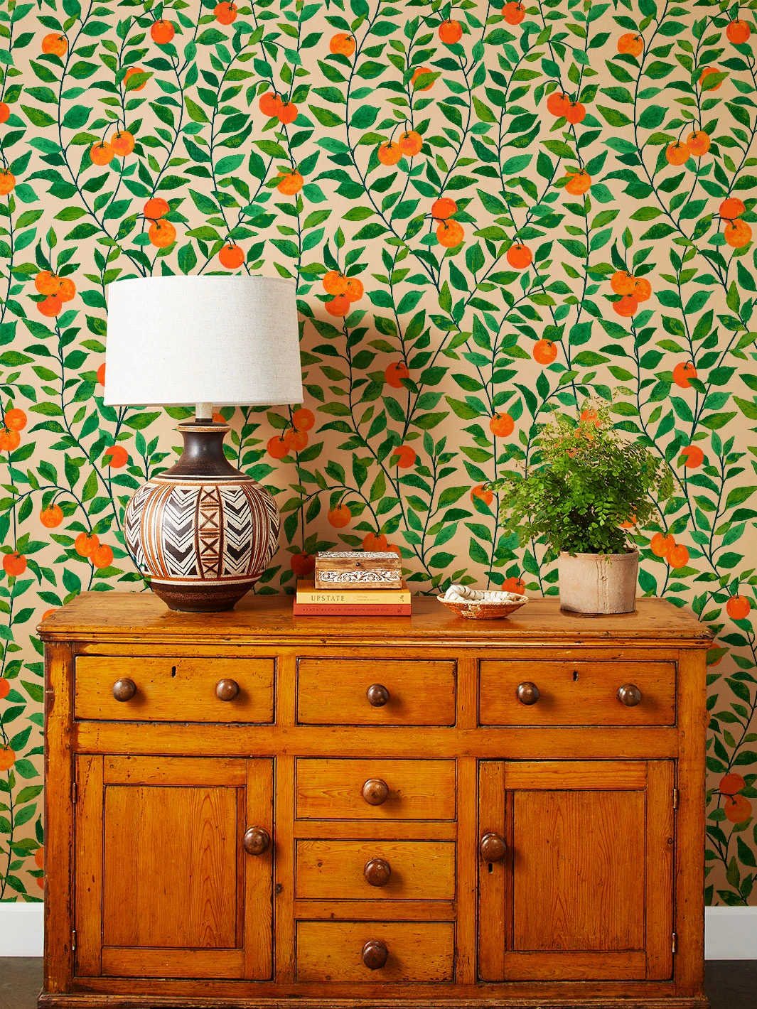 Renowned designer Nathan Turner collaborated with us on this fruitful wallpaper. Oranges are a symbol of love in many cultures, so make it harvest season in your home all year round with our orange tree wallpaper.