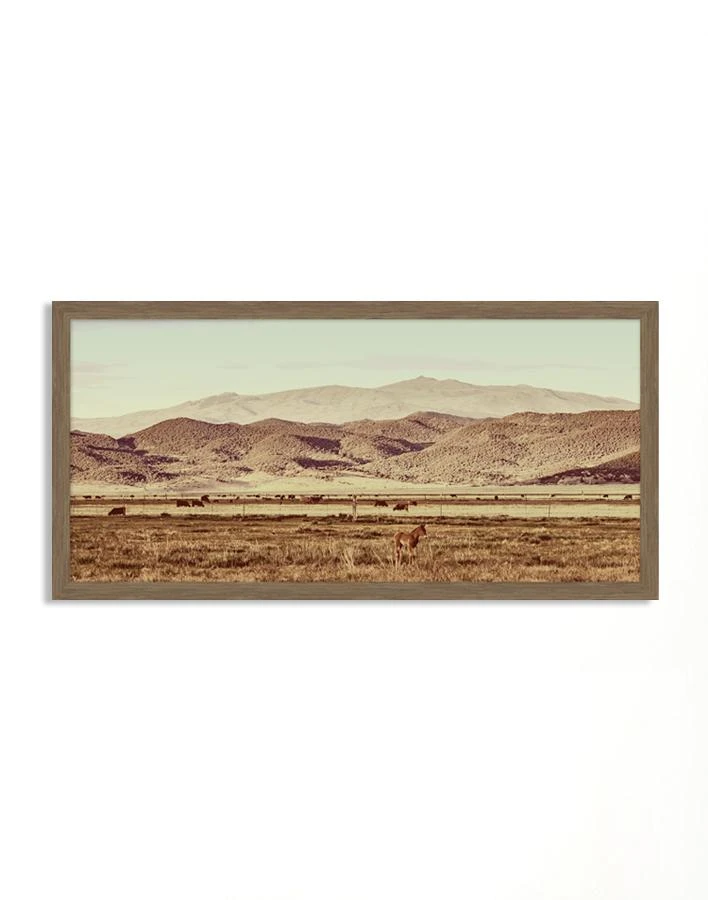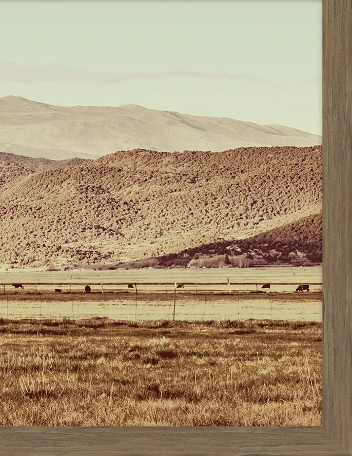 Nathan Turner takes us back to his childhood with this photograph of the Sierra Nevada Ranches in the perfect sepia shades. The gray woodgrain fraiming complements the colors. Perfect for a home office or entryway.