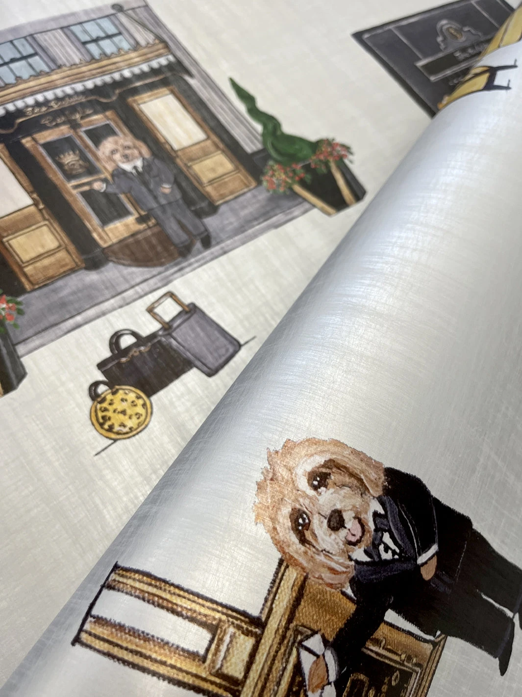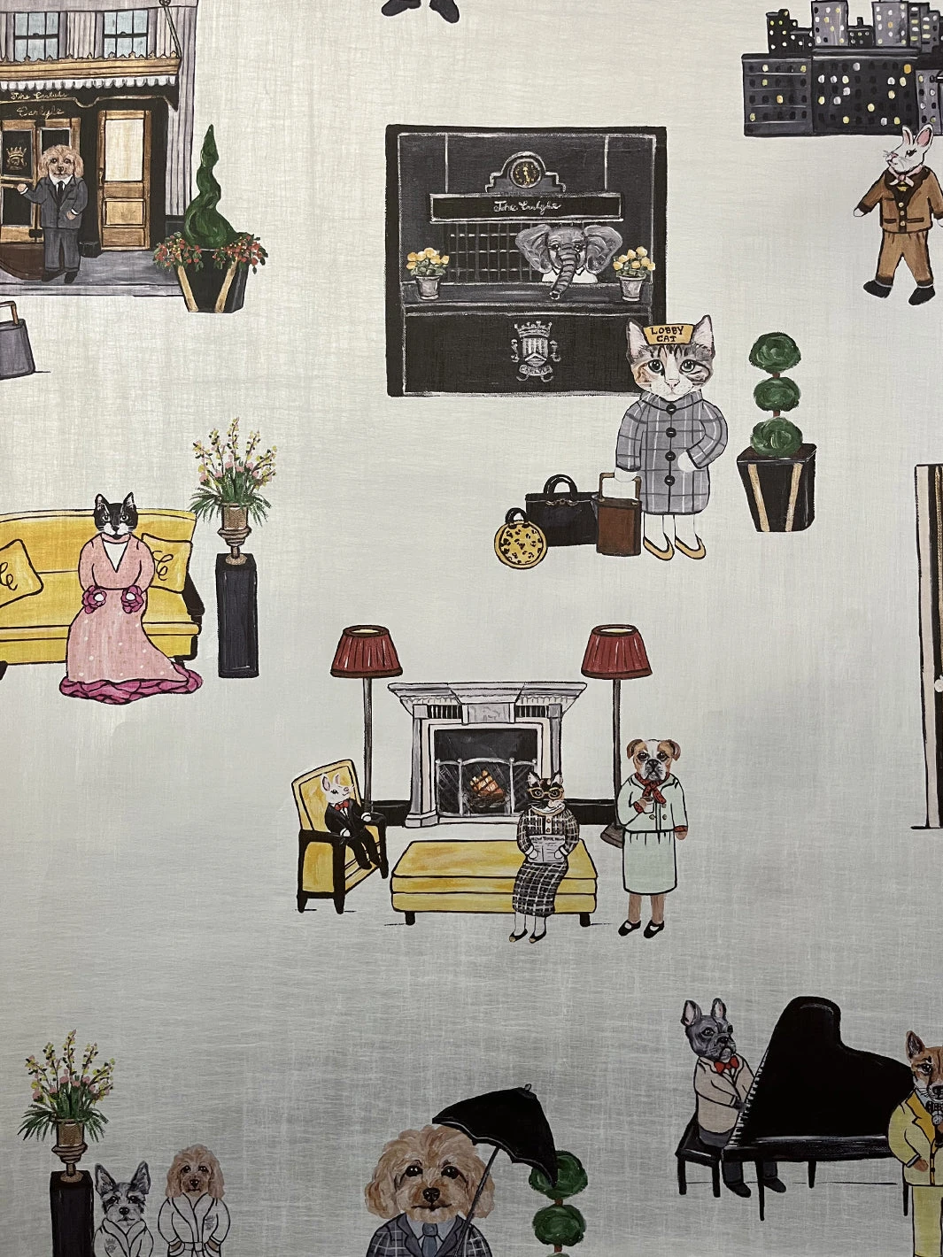 Featuring the most whimsical & sophisticated pets we have ever met, Carly Beck’s newest wallpaper design is inspired by The Carlyle. Whether enjoying a spa day, hailing a cab, or just looking fabulous in the lobby, these cute characters make for the perfect conversation wallpaper. Shown here with a unique matte silver background.
